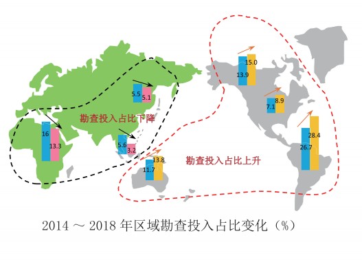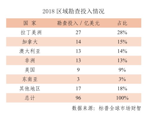 2018年全球礦產(chǎn)勘查投入主要集中在南北美、澳大利亞和非洲,占比79%。