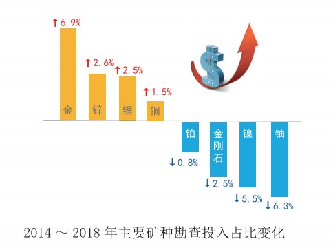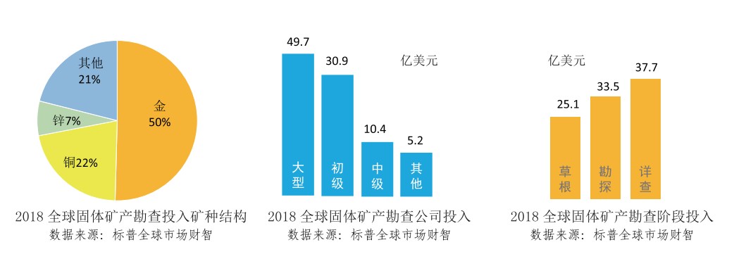 全球固體礦產(chǎn)勘查投入主要集中在金、銅和鋅等礦種,2018年勘查投入占比分別為50%、22%和7%。大型礦業(yè)公司是勘查市場主力軍,草根勘查投入低于后期成熟階段的勘查投入。
