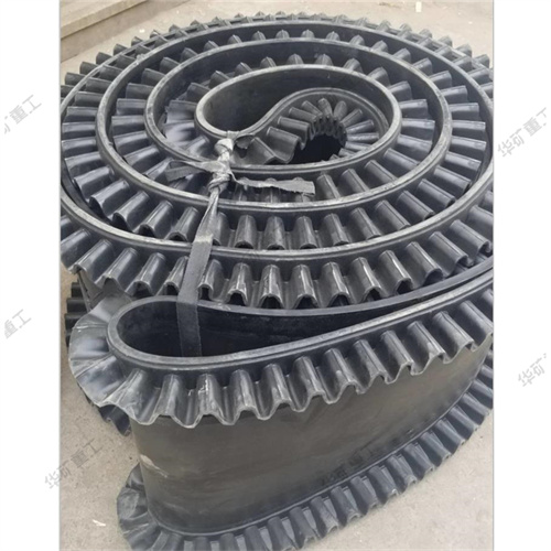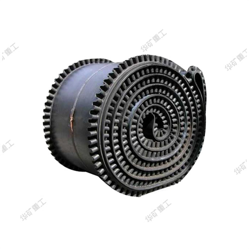 大傾角輸送帶由基帶、擋邊、橫隔板3部分組成。擋邊起防止物料測滑撒落的作用。為便于繞過滾筒,檔邊設(shè)計(jì)成波紋狀;橫隔板的作用是承托物料,為了實(shí)現(xiàn)大傾角輸送,采用T型TC型。檔邊和橫隔板是用二次硫化的方法與基帶連接的,具有很高的連接強(qiáng)度