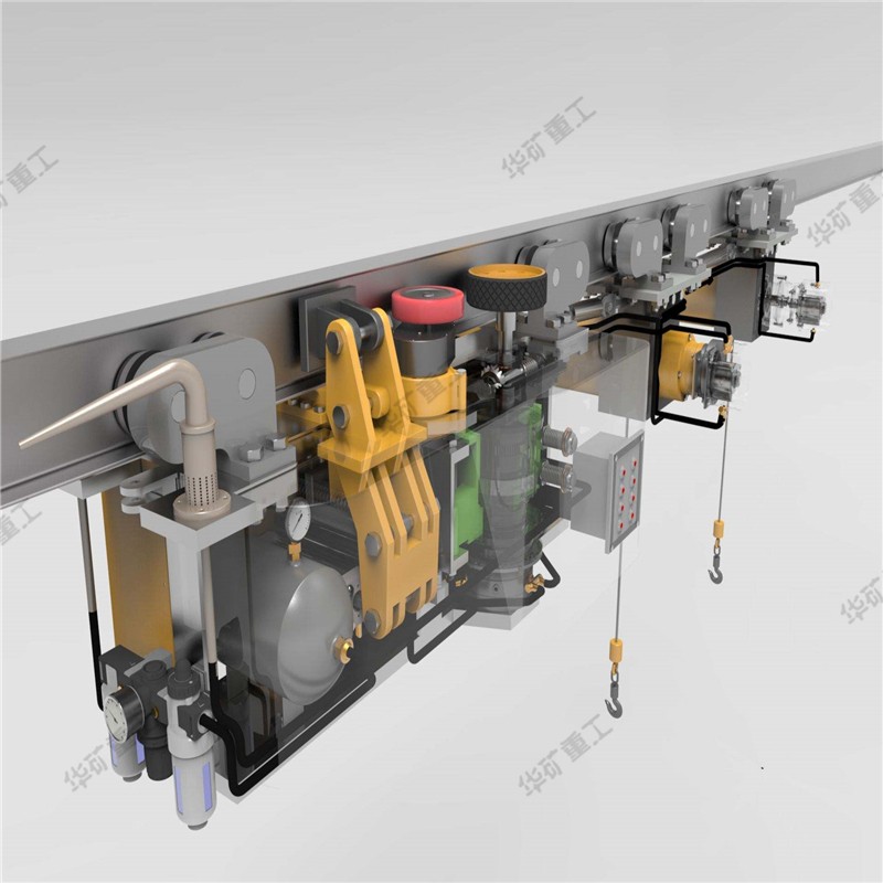 單軌吊車是用一條吊掛在巷道上空的特制工字鋼作軌道,由具有各種功能的吊掛車輛連成車組,用牽引設(shè)備牽引,沿軌道運(yùn)行的系統(tǒng)。其牽引動(dòng)力可由鋼絲繩、柴油機(jī)、蓄電池或風(fēng)動(dòng)裝置提供。